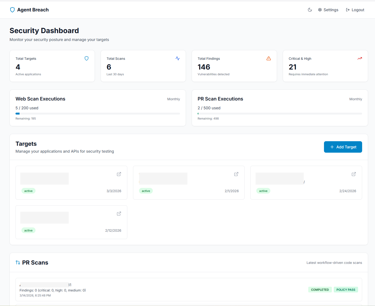 Agent Breach is a cloud platform for teams who need real-world vulnerability coverage without slowing releases — including authenticated apps, APIs, and compliance-ready reporting.